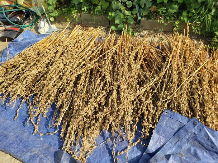 The sesame pods are still green when harvested and laid out to dry in the sun for some days, until they turn brown.